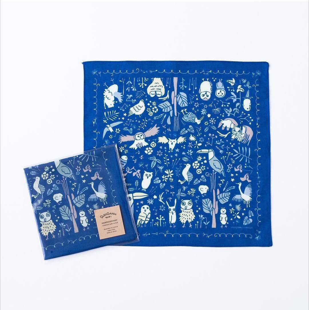 るるる製作所(咲く屋)のみんなのイラストが、大人の女性にも使いやすいデザインのコットンハンカチになりました。
