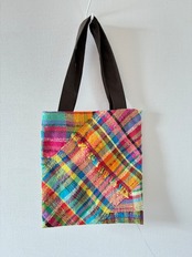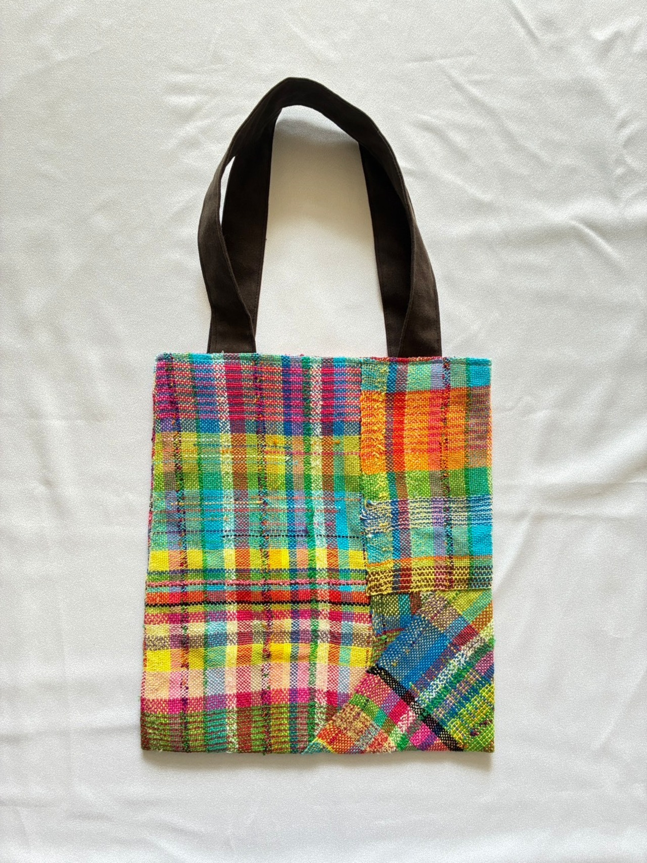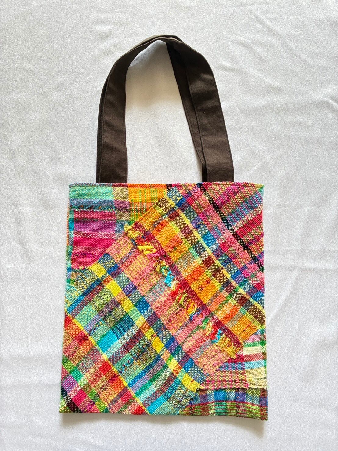 さをり織りのトートバッグで、綿糸中心に織られていて、かわいくてあたたかみのある風合いです。