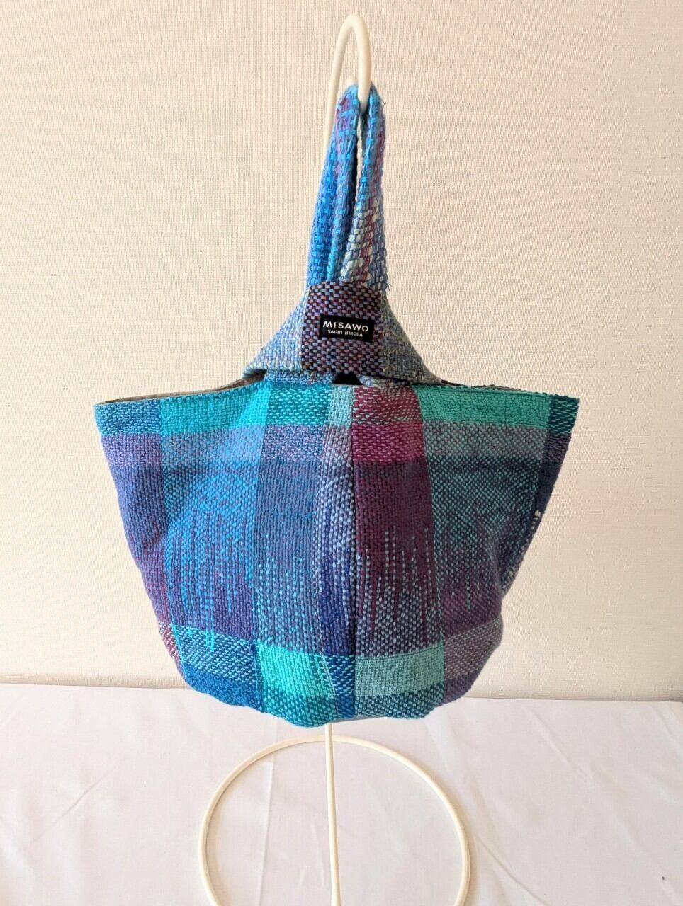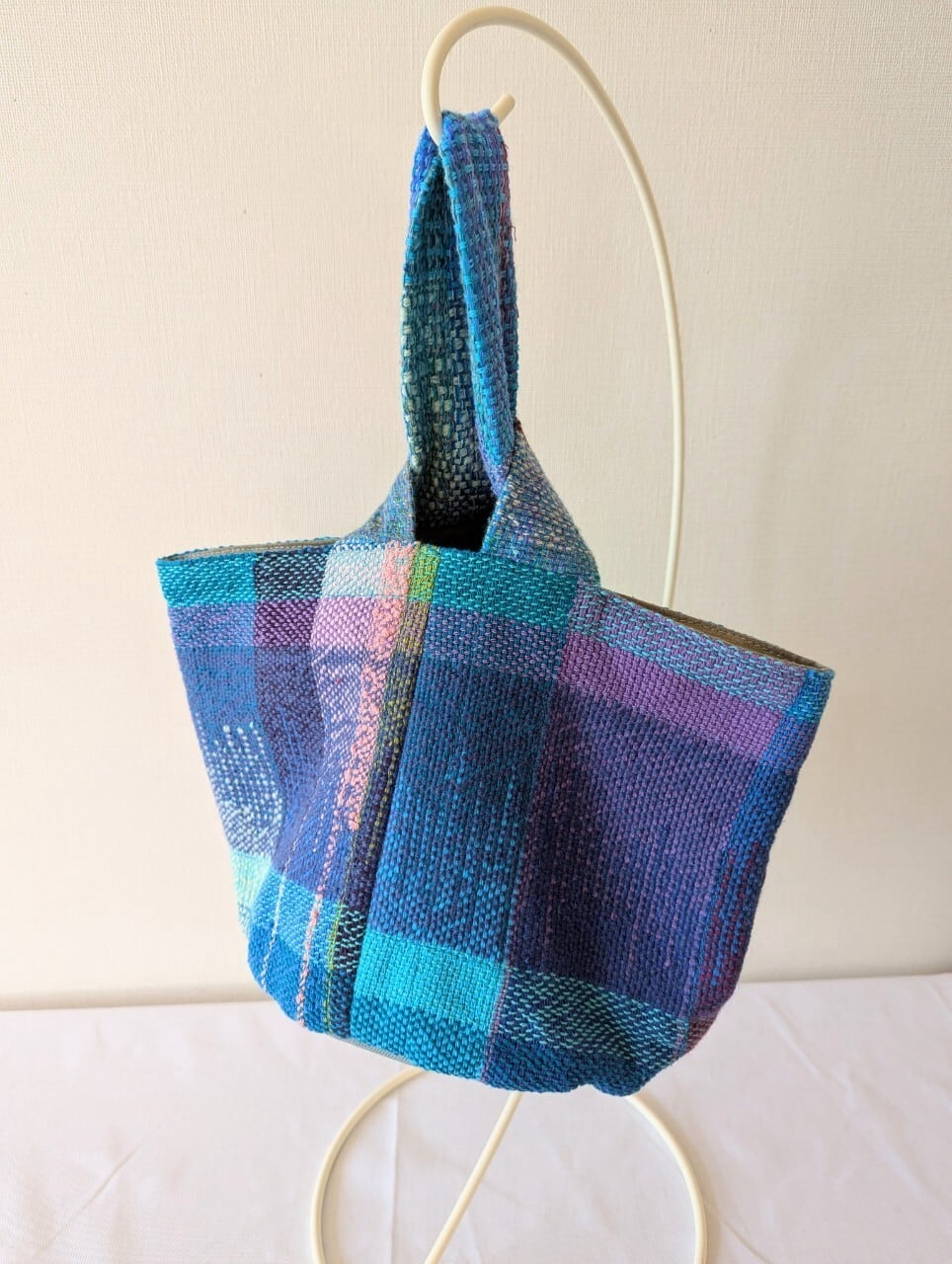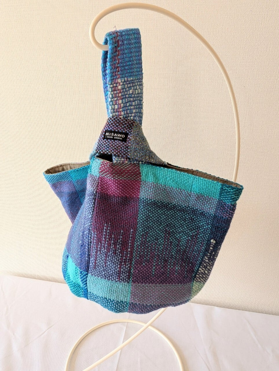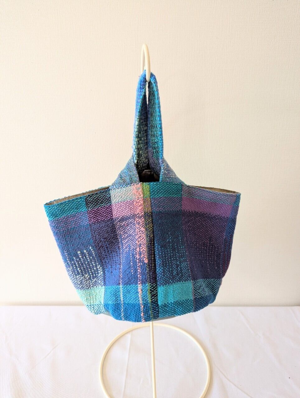 さをり織りのトートバッグで、綿糸中心に織られていてほっこりあたたかみのある風合いです。底は帆布を使用しているため、丈夫です。長財布やスマホなどちょっとしたお出掛けにちょうどいいサイズです。