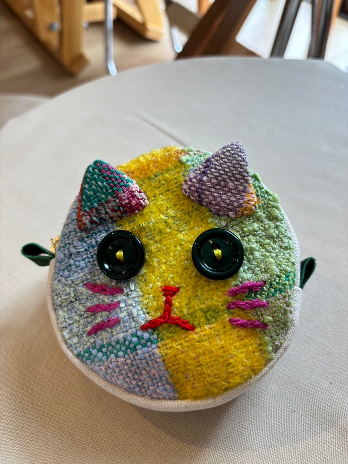 さをり織りのかわいいまるねこポーチです。愛らしい猫のデザインで、どこにでも持ち運びやすい形状です。一つ一つ異なる色柄が魅力的です。