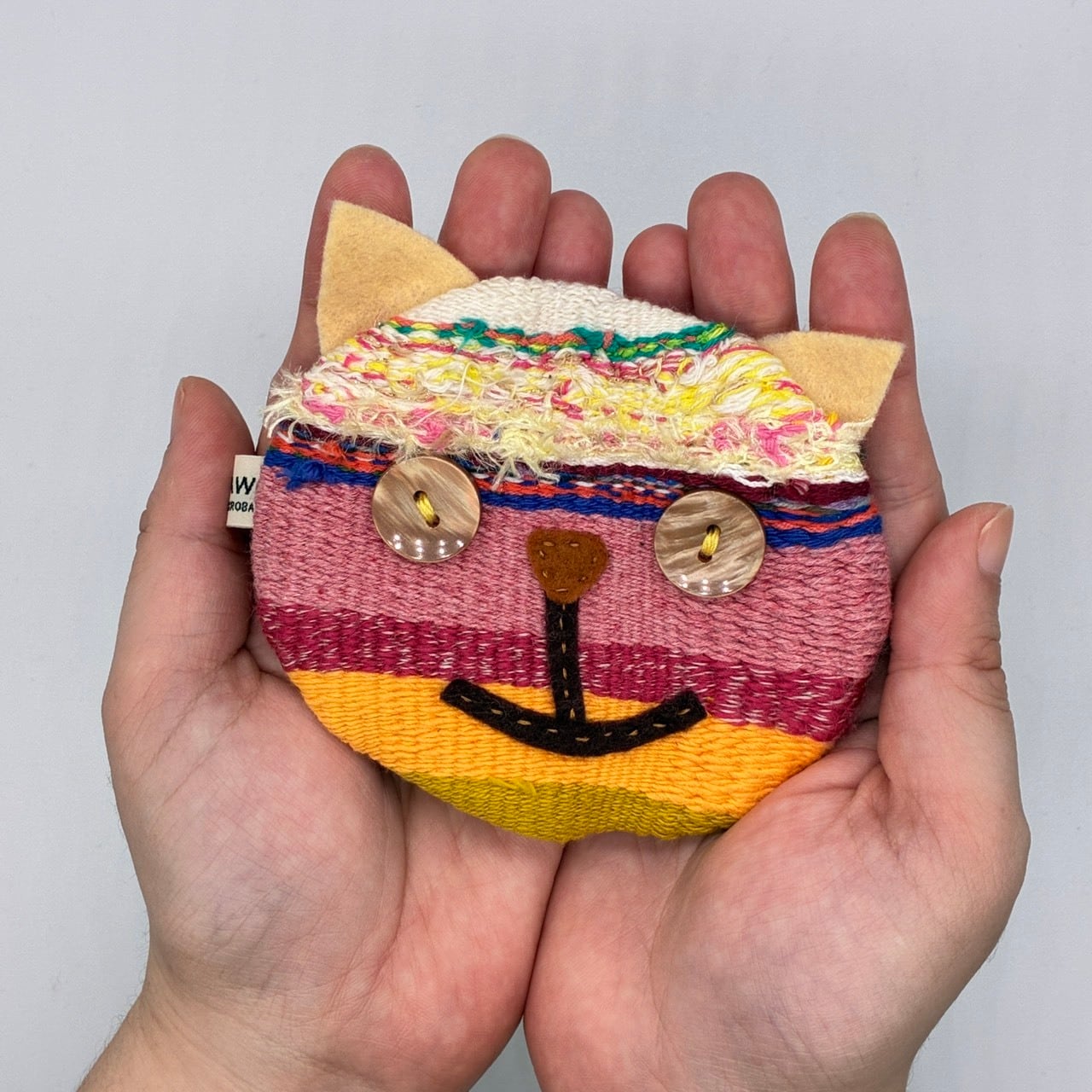 さをり織りのかわいい小さめねこポーチです。愛らしい猫のデザインで、どこにでも持ち運びやすい形状です。一つ一つ異なる色柄が魅力的です。