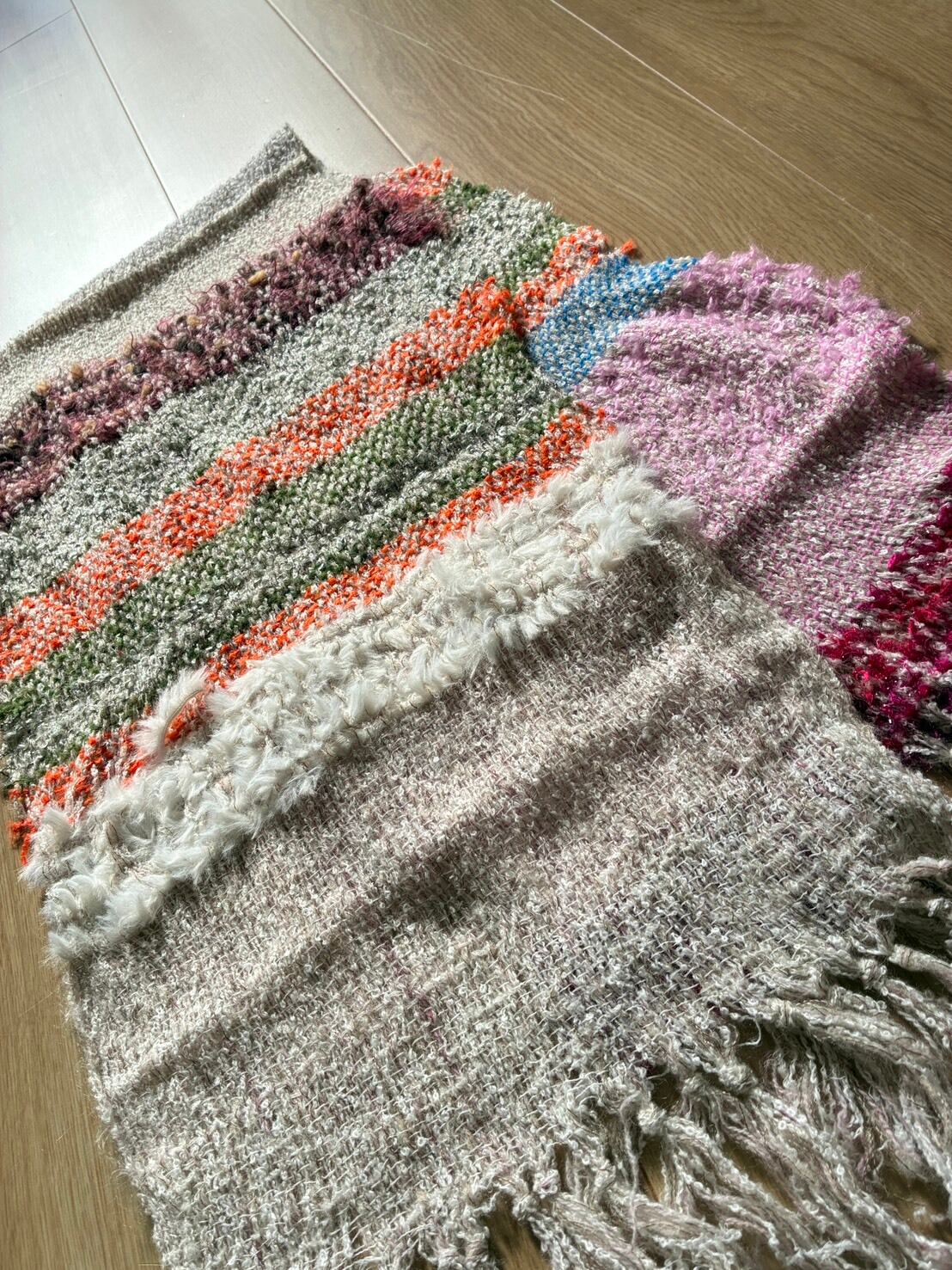 素材や織りの力加減、縮絨の具合により、織巾は一定ではありません。そこも手作りの味わいとして愛でてください。ノークレーム、ノーリターンでお願いします。
