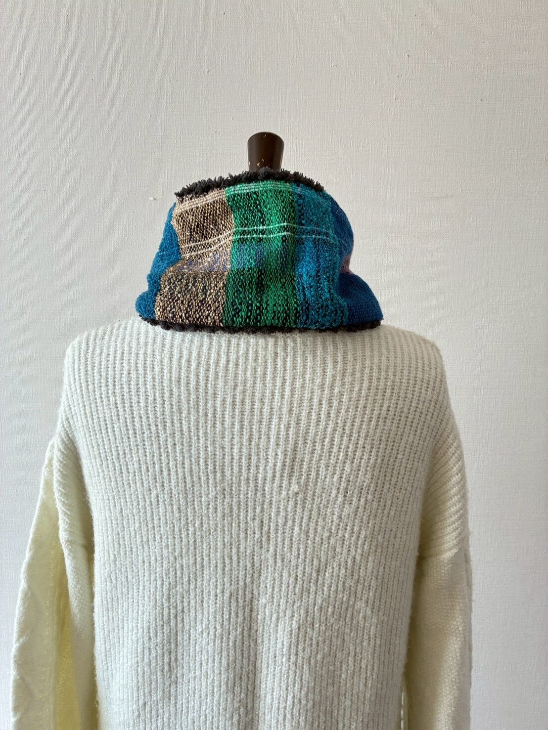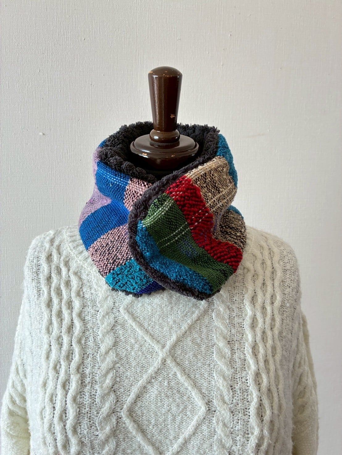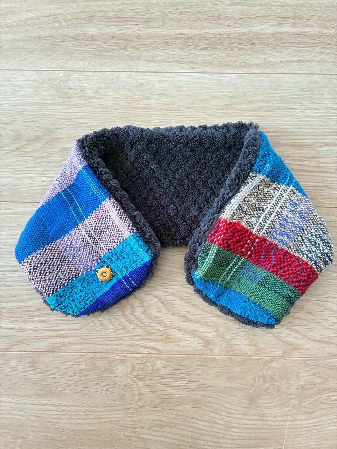 さをり織りとボアを使ったスヌードです。今年は、磁石で止めるタイプ。サッと留められて使いやすい。