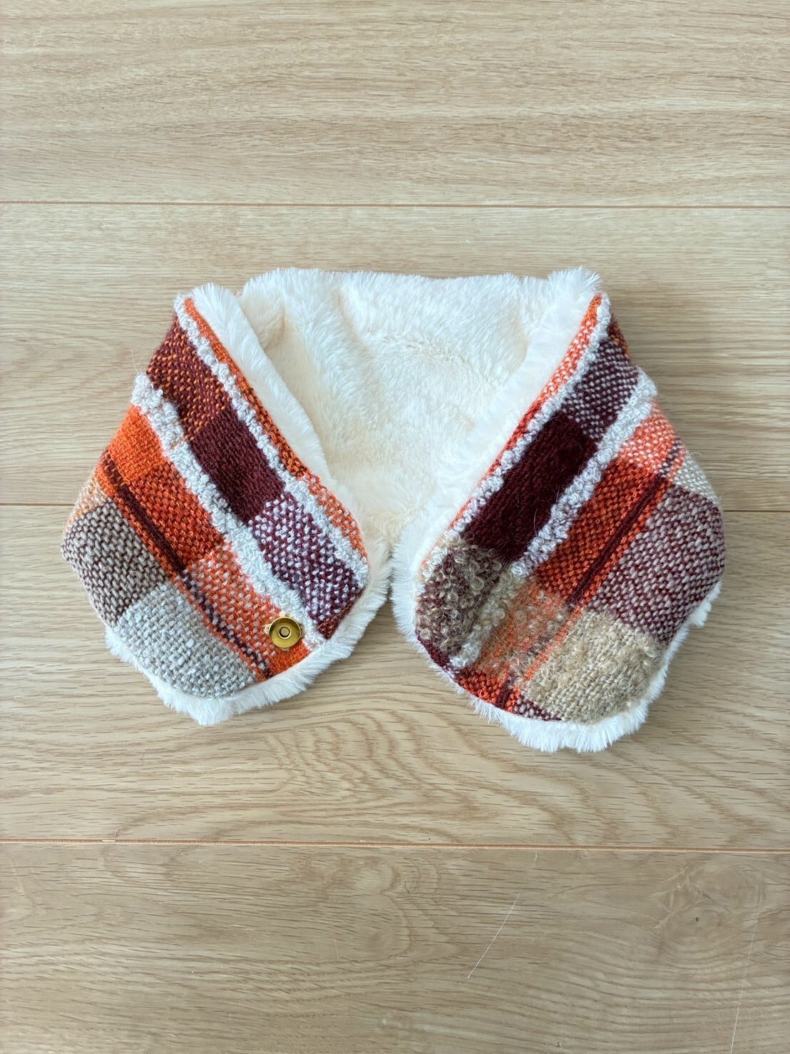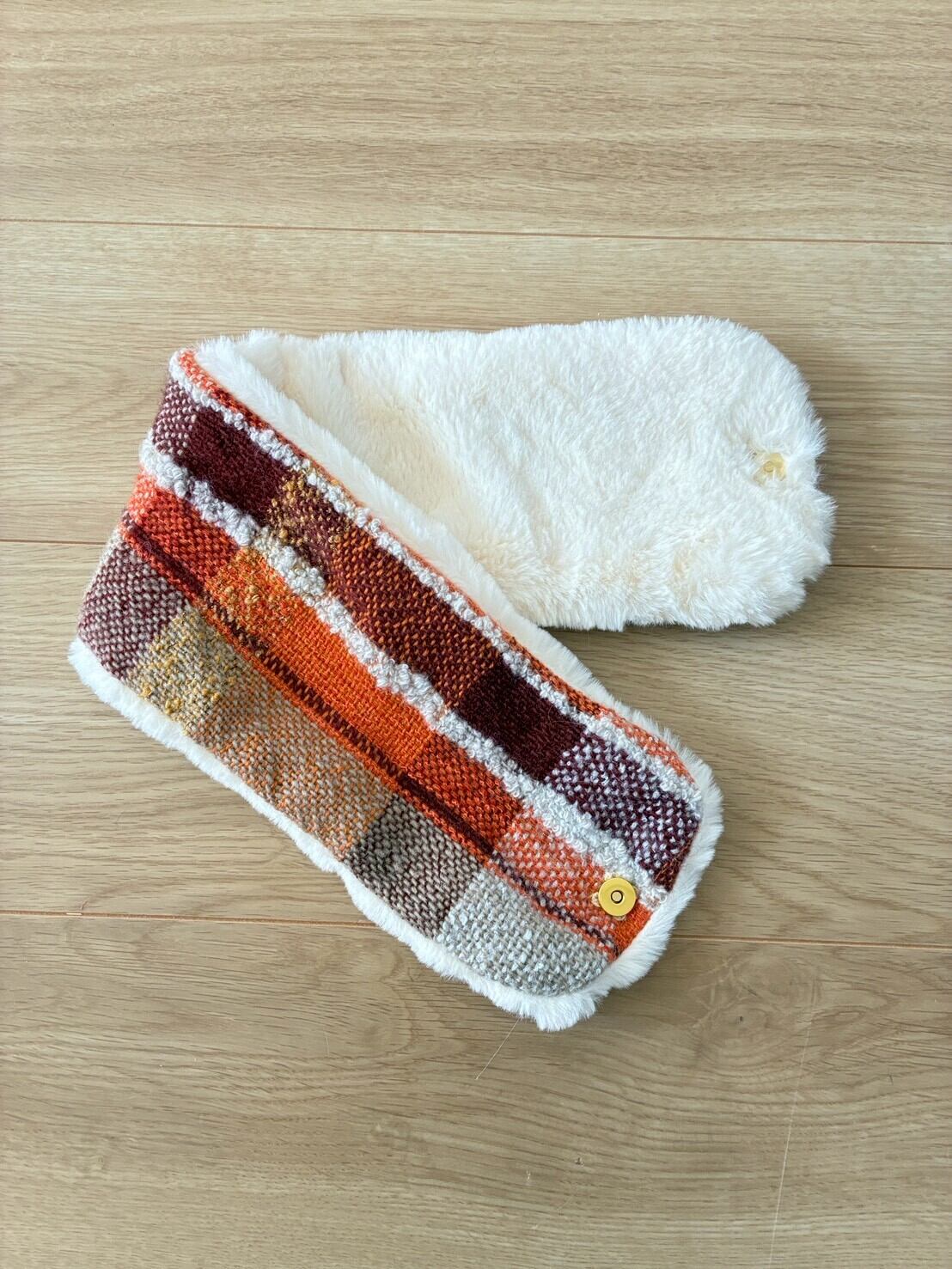 さをり織りとボアを使ったスヌードです。今年は、磁石で止めるタイプ。サッと留められて使いやすい。
