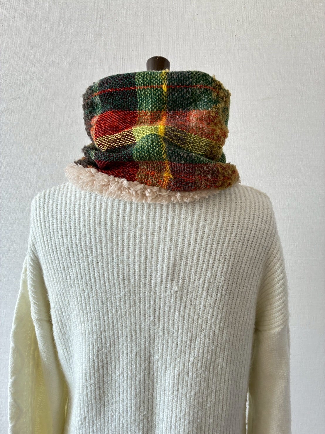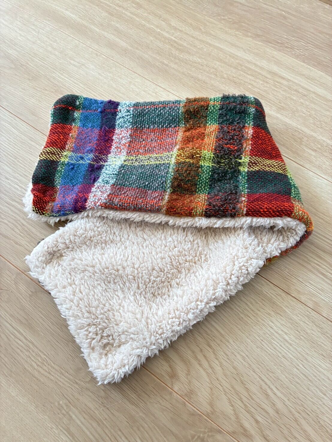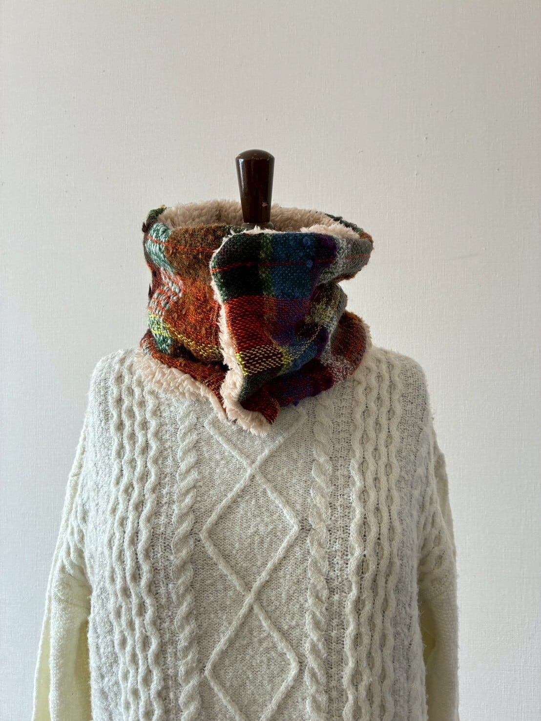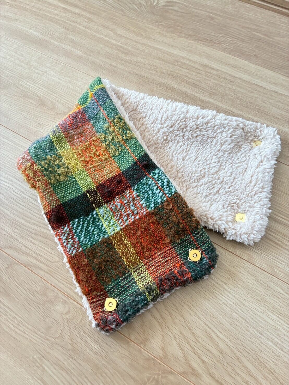 さをり織りとボアを使ったスヌードです。今年は、磁石で止めるタイプ。サッと留められて使いやすい。