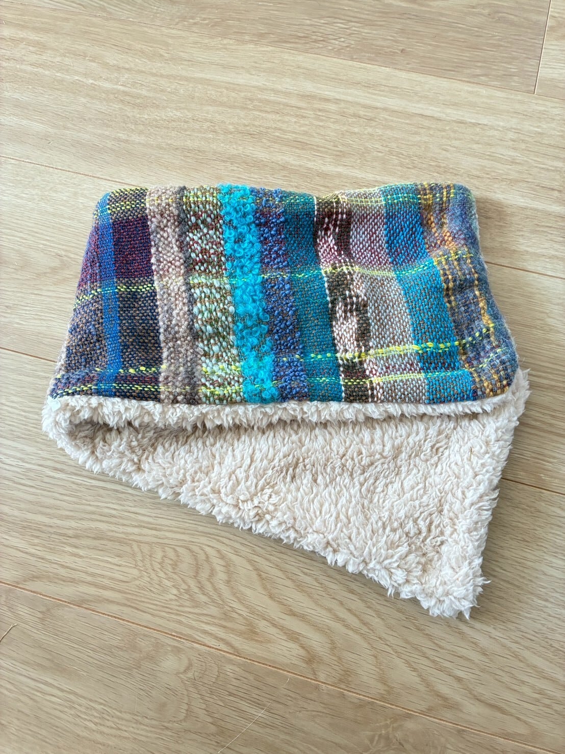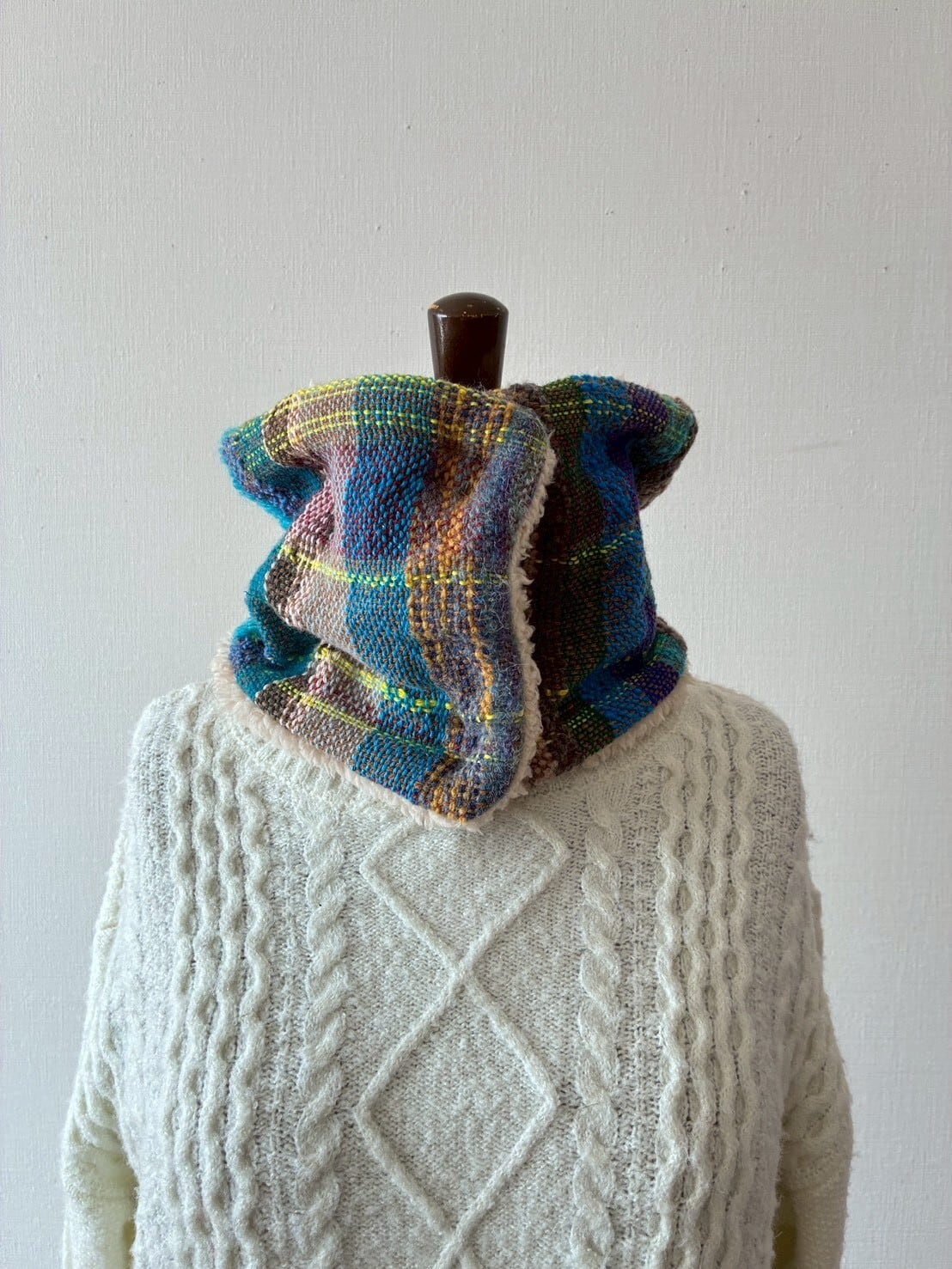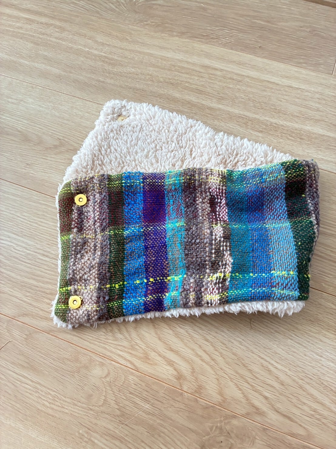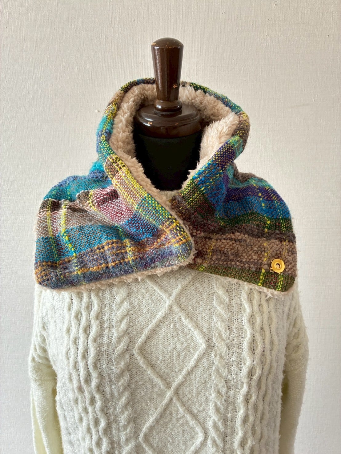 さをり織りとボアを使ったスヌードです。今年は、磁石で止めるタイプ。サッと留められて使いやすい。