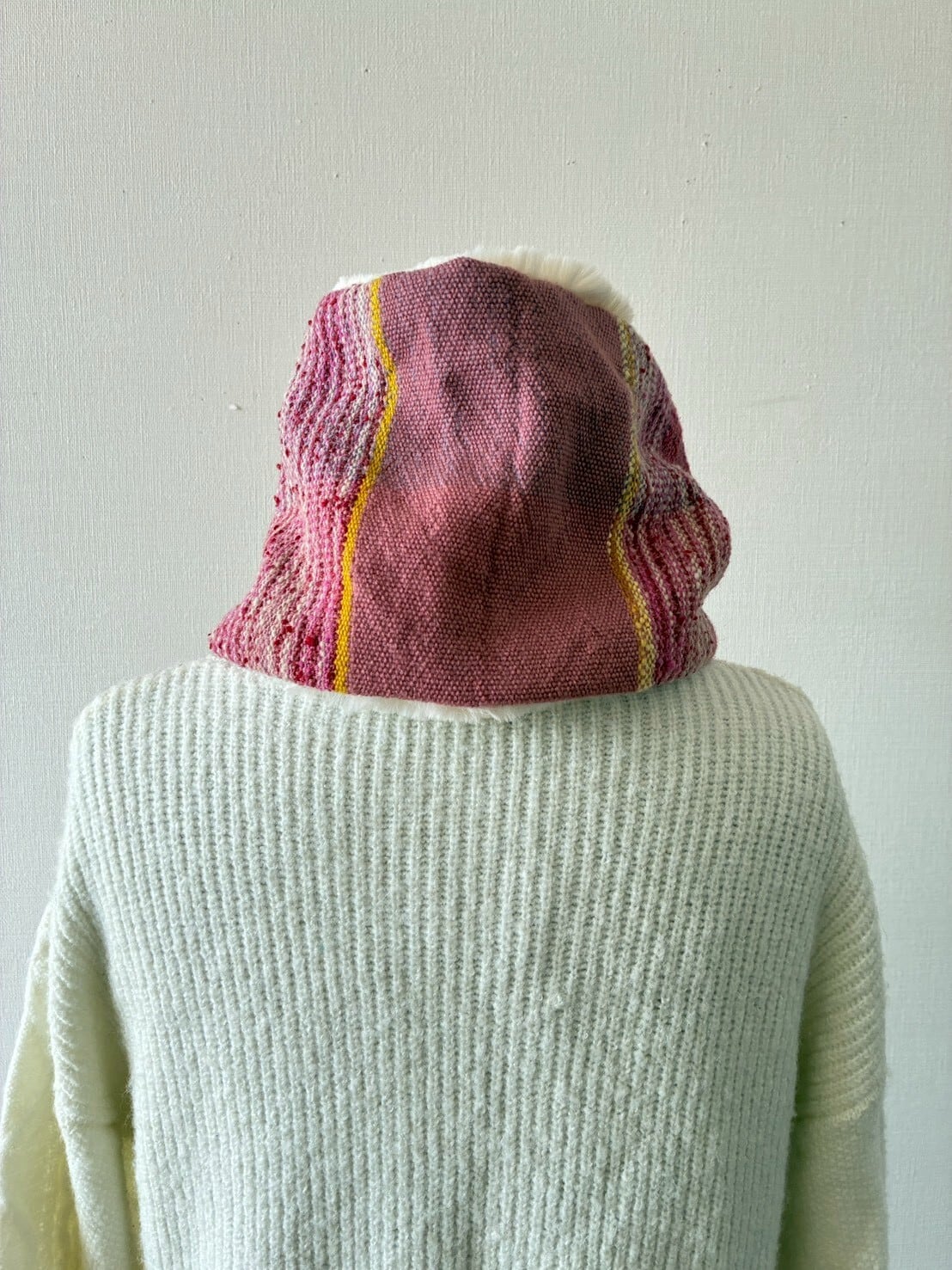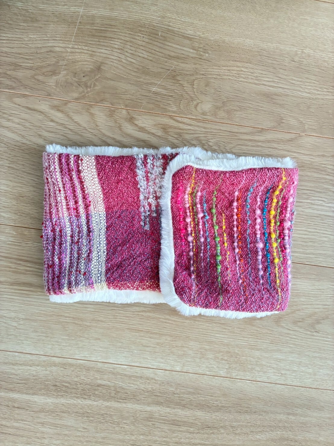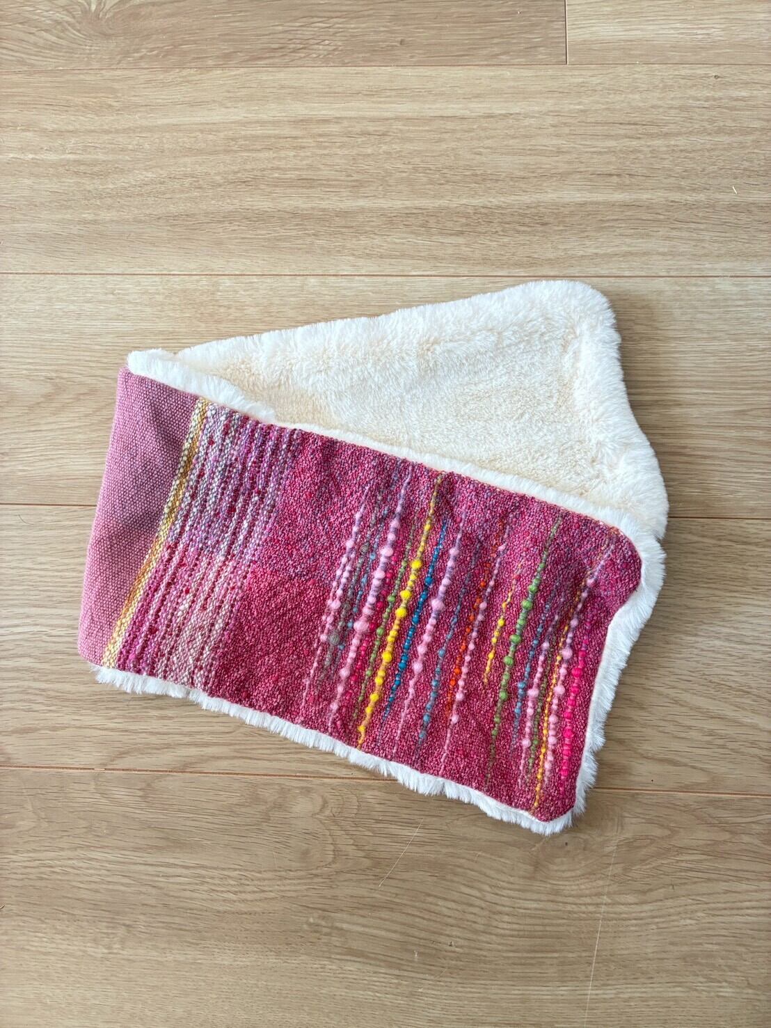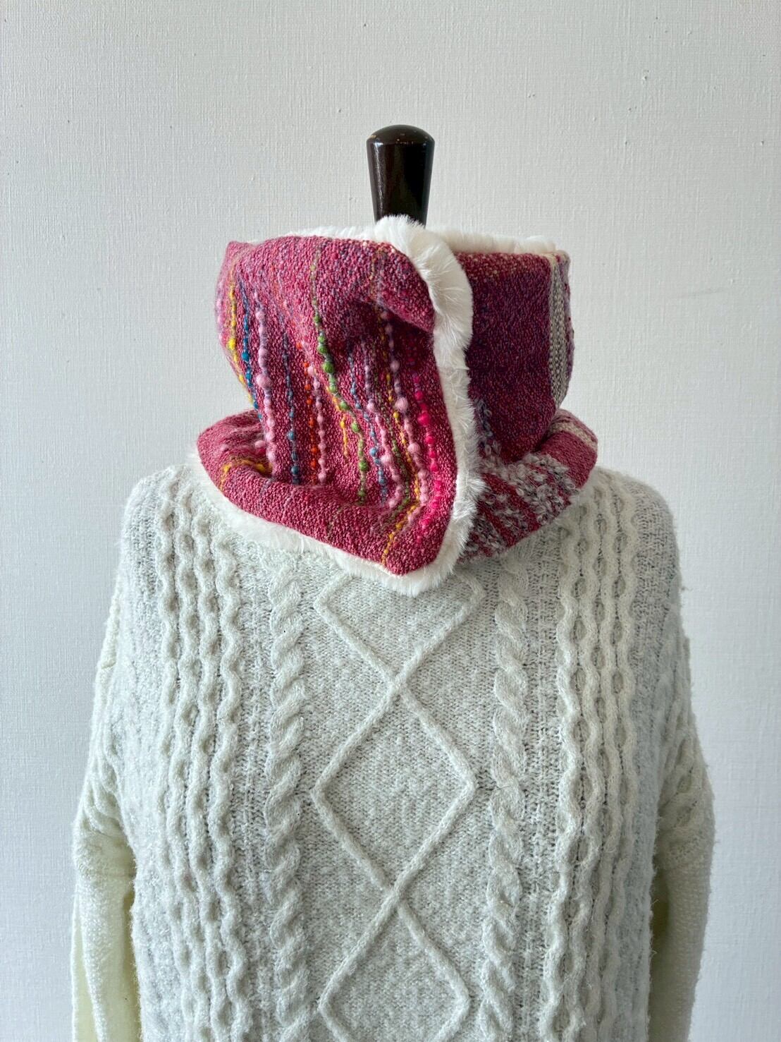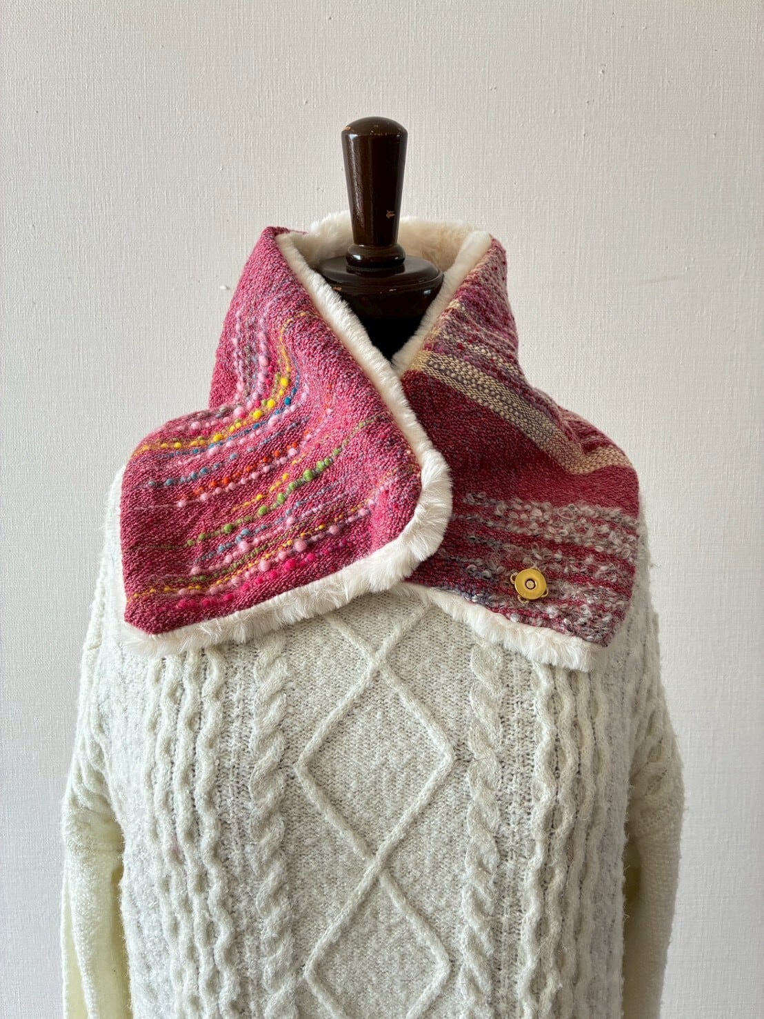 さをり織りとボアを使ったスヌードです。今年は、磁石で止めるタイプ。サッと留められて使いやすい。