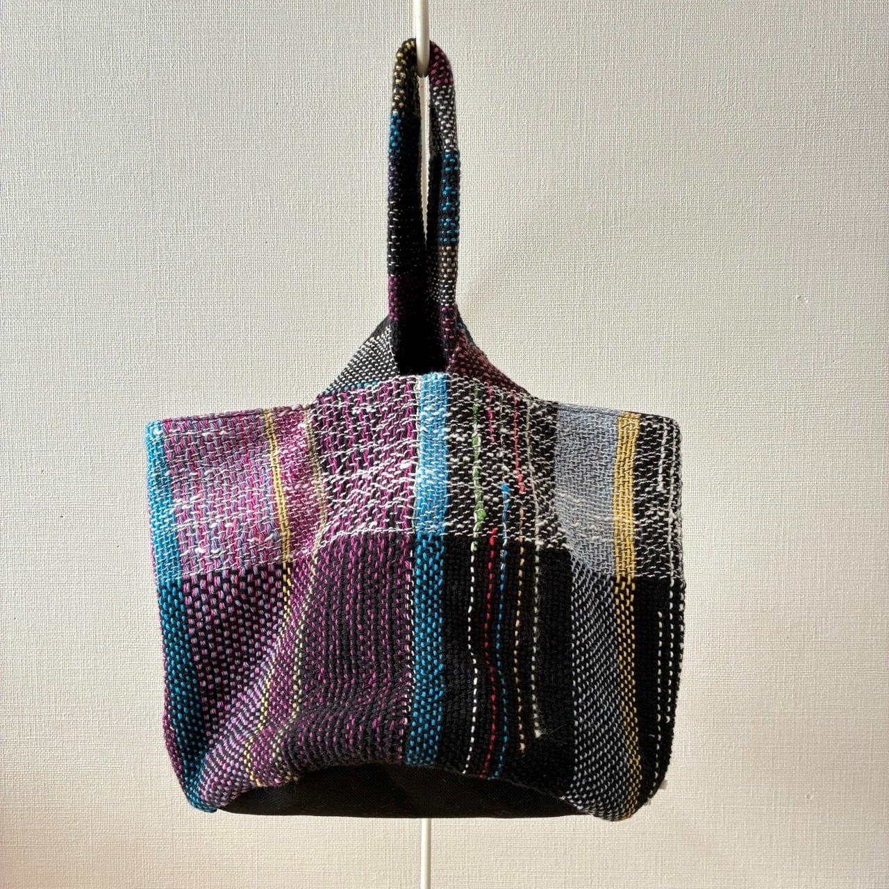 さをり織りのトートバッグで、綿糸中心に織られていてほっこりあたたかみのある風合いです。底は帆布を使用しているため、丈夫です。長財布やスマホなどちょっとしたお出掛けにちょうどいいサイズです。
