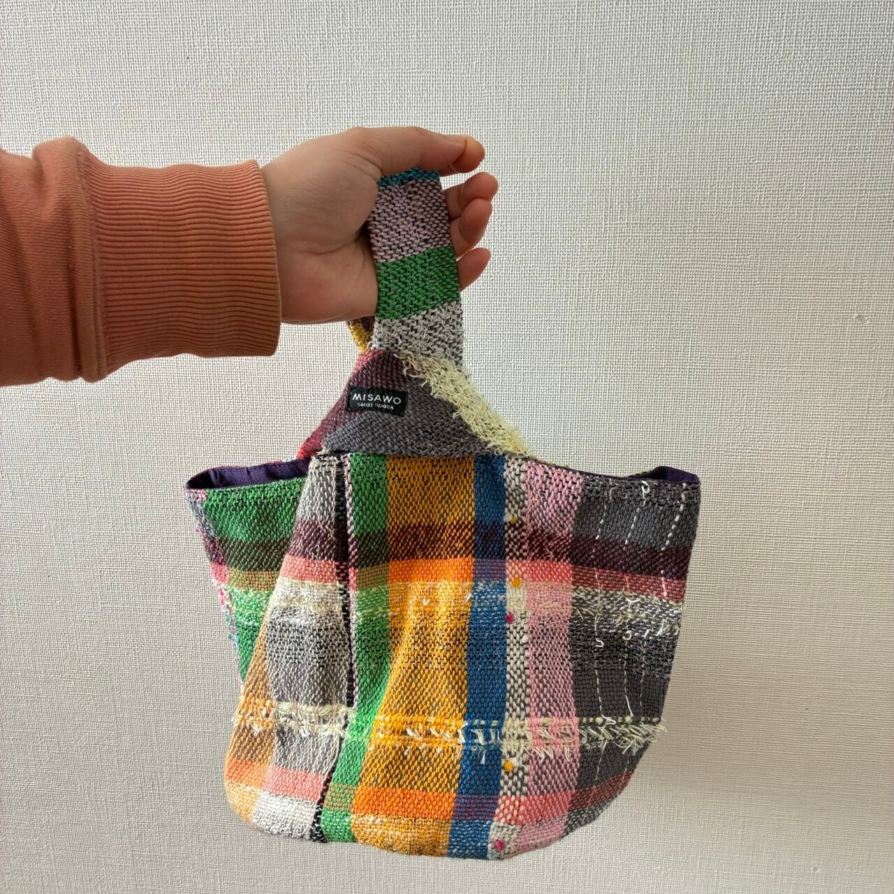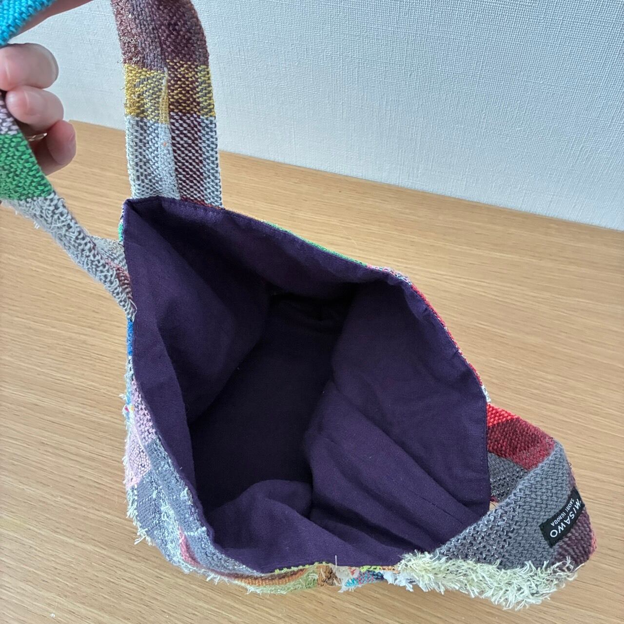 さをり織りのトートバッグで、綿糸中心に織られていてほっこりあたたかみのある風合いです。底は帆布を使用しているため、丈夫です。長財布やスマホなどちょっとしたお出掛けにちょうどいいサイズです。