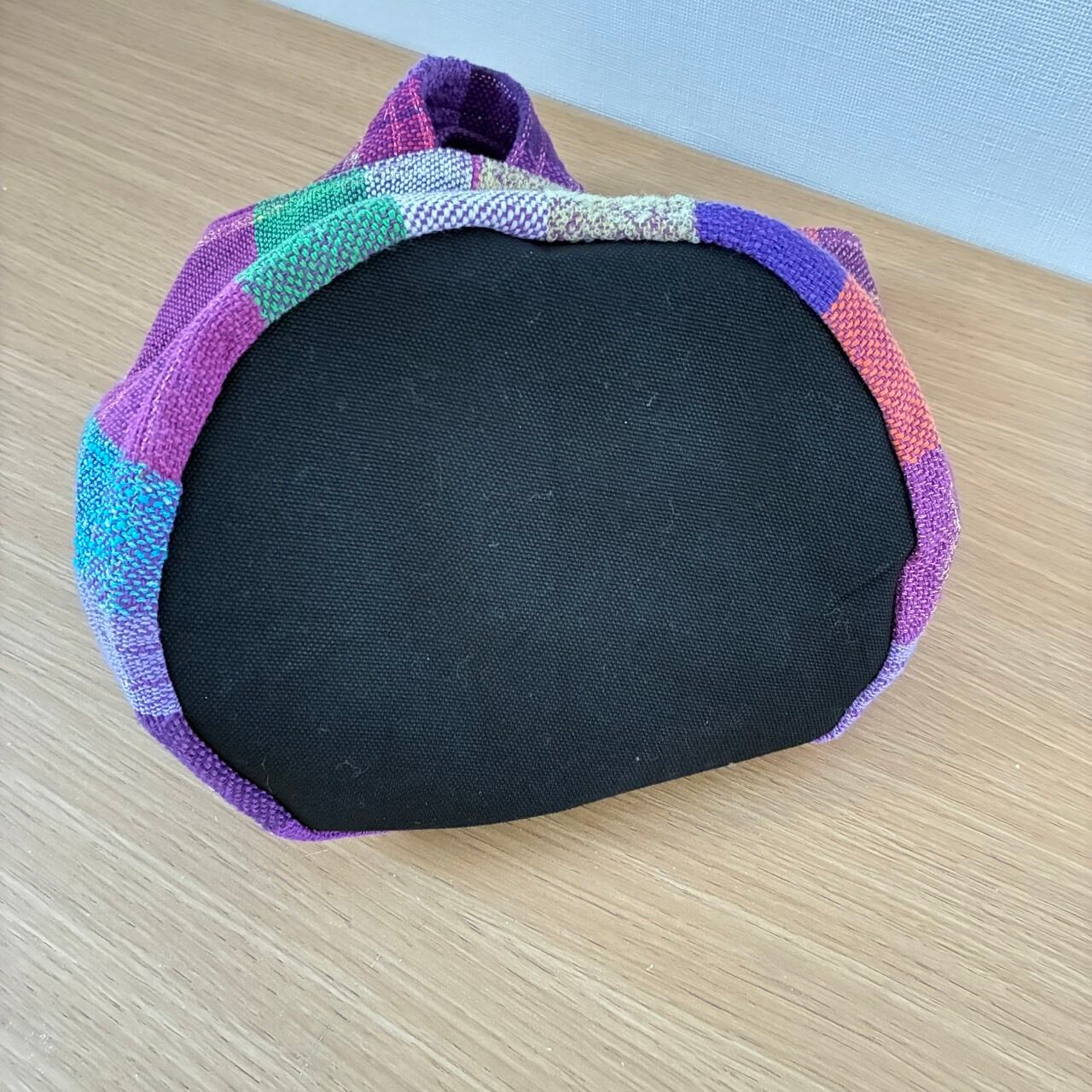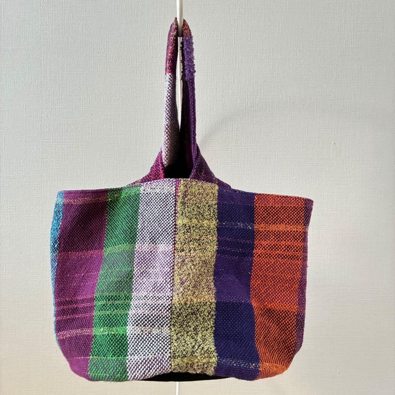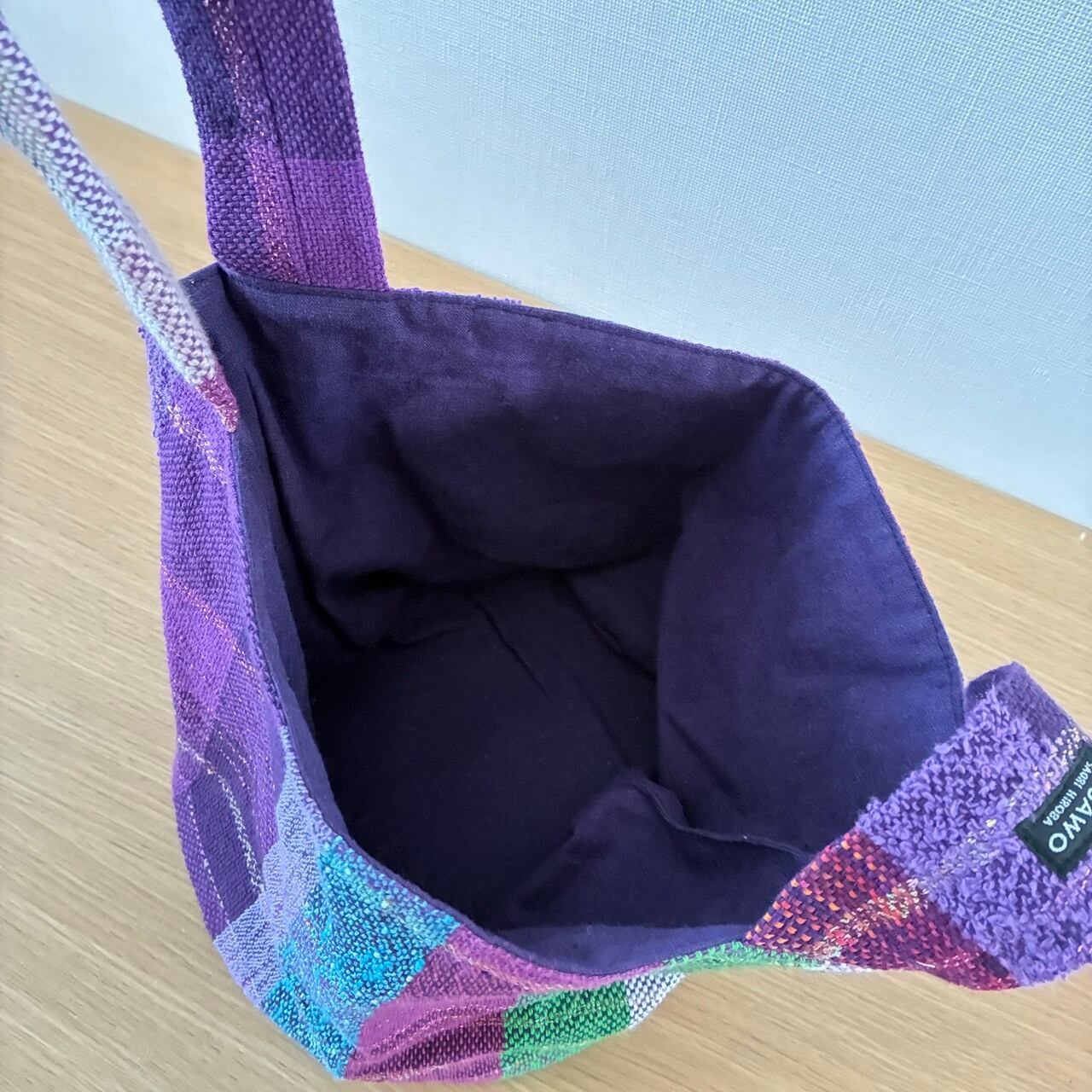 さをり織りのトートバッグで、綿糸中心に織られていてほっこりあたたかみのある風合いです。底は帆布を使用しているため、丈夫です。長財布やスマホなどちょっとしたお出掛けにちょうどいいサイズです。