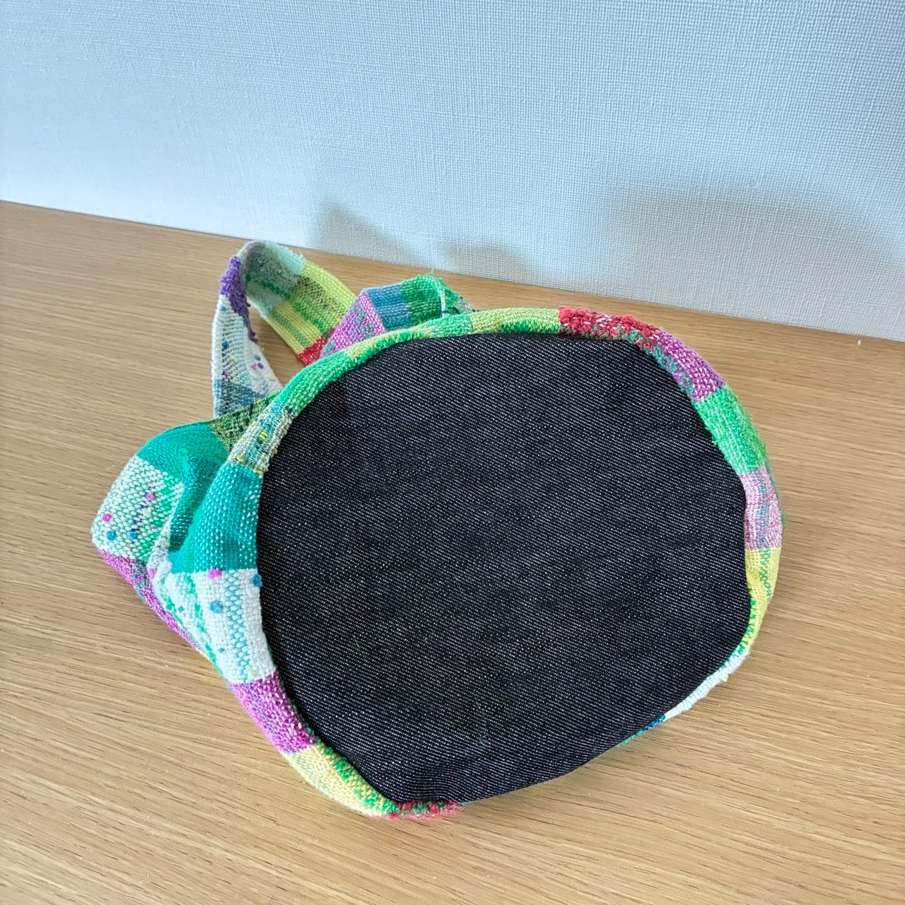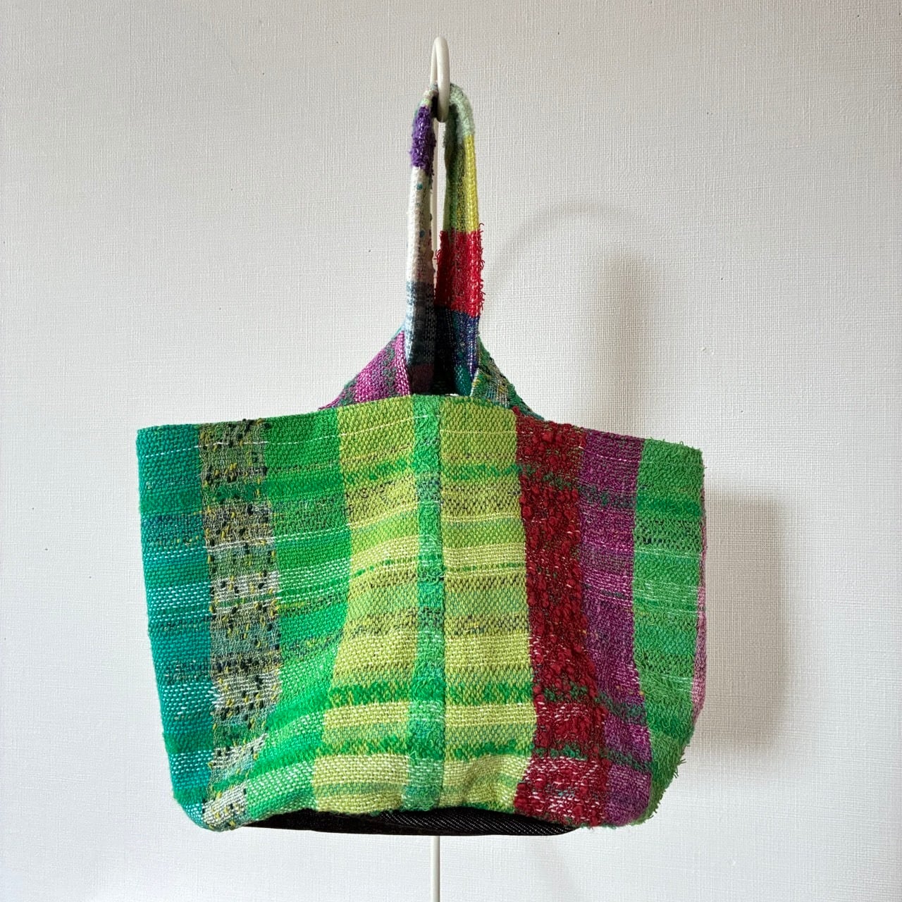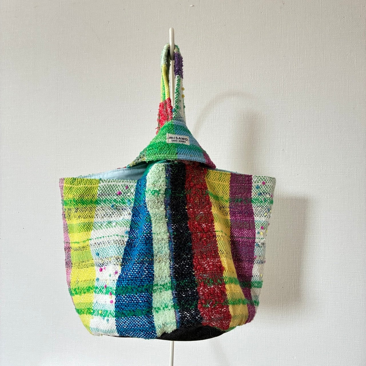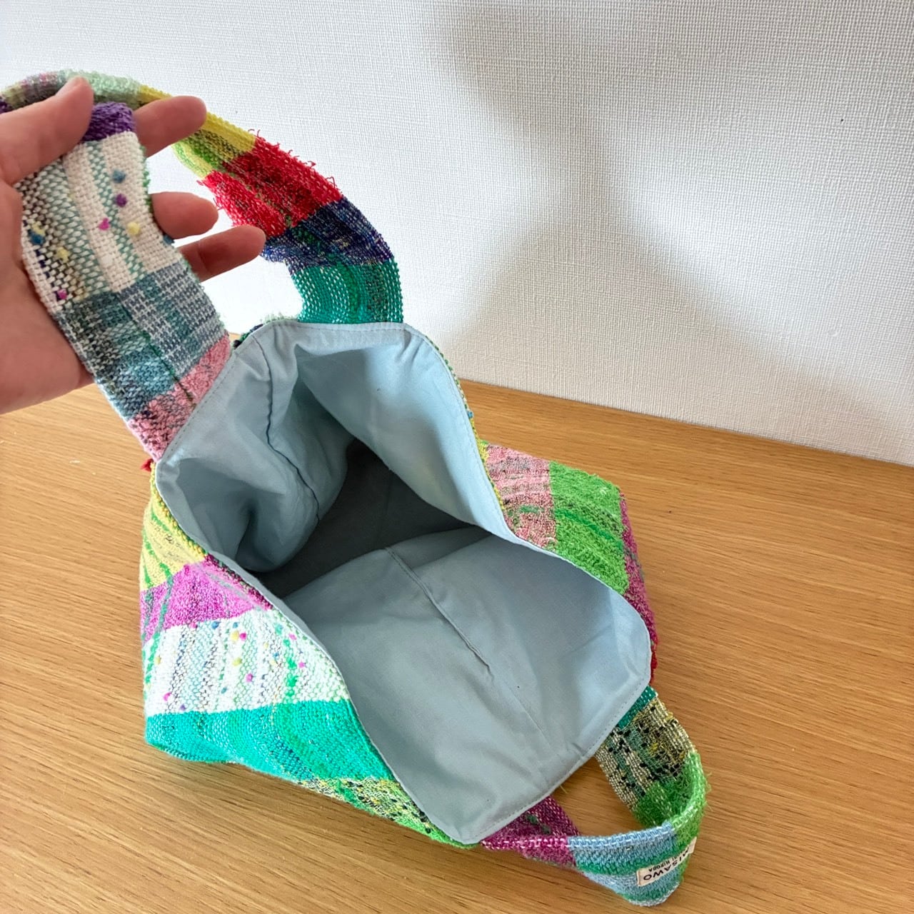 さをり織りのトートバッグで、綿糸中心に織られていてほっこりあたたかみのある風合いです。底は帆布を使用しているため、丈夫です。長財布やスマホなどちょっとしたお出掛けにちょうどいいサイズです。