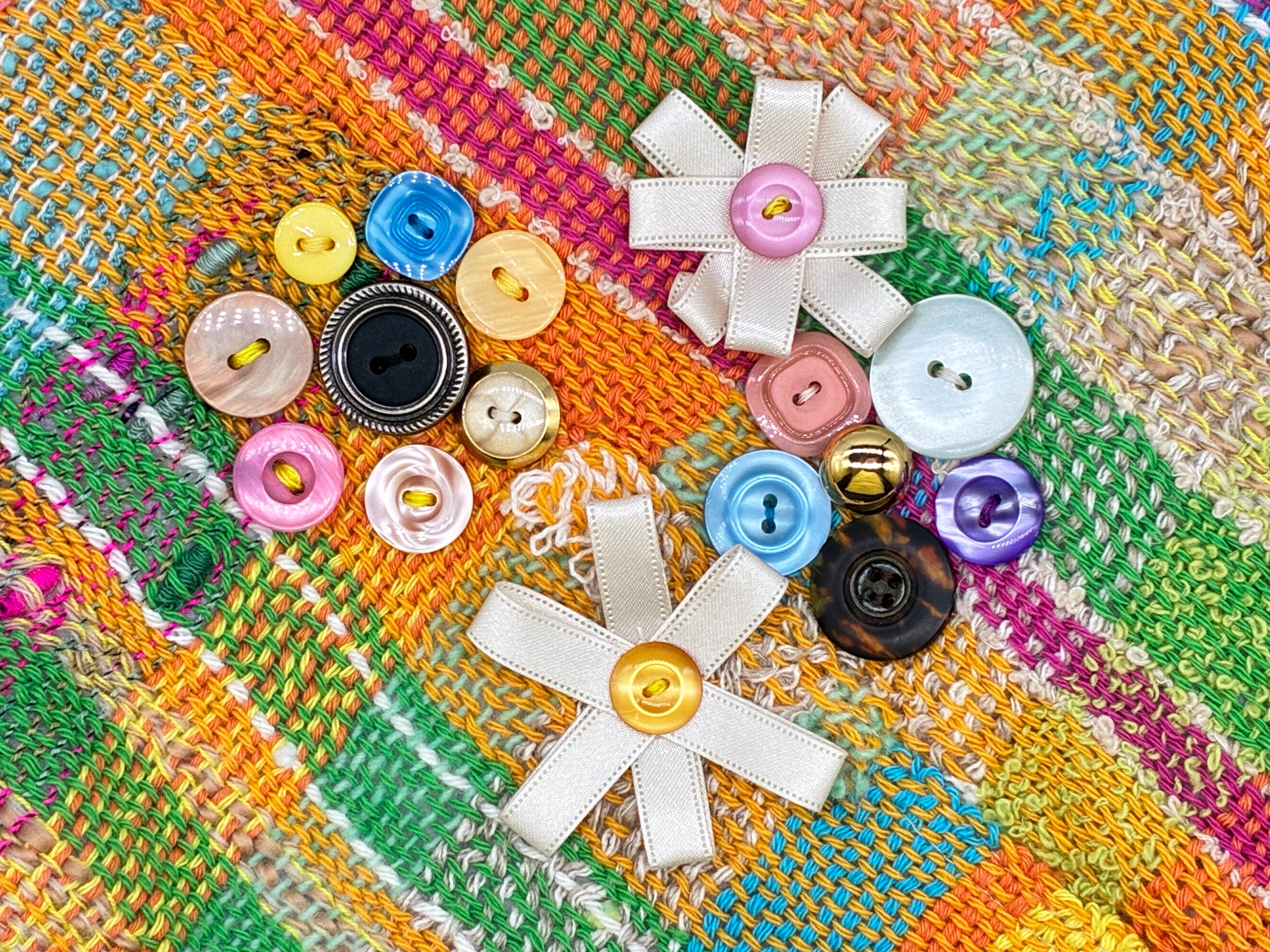 さをり織りのかわいいファスナーポーチです。さをり織りに、ボタンを使った飾りを縫い付けました。一つ一つ色柄が違います。