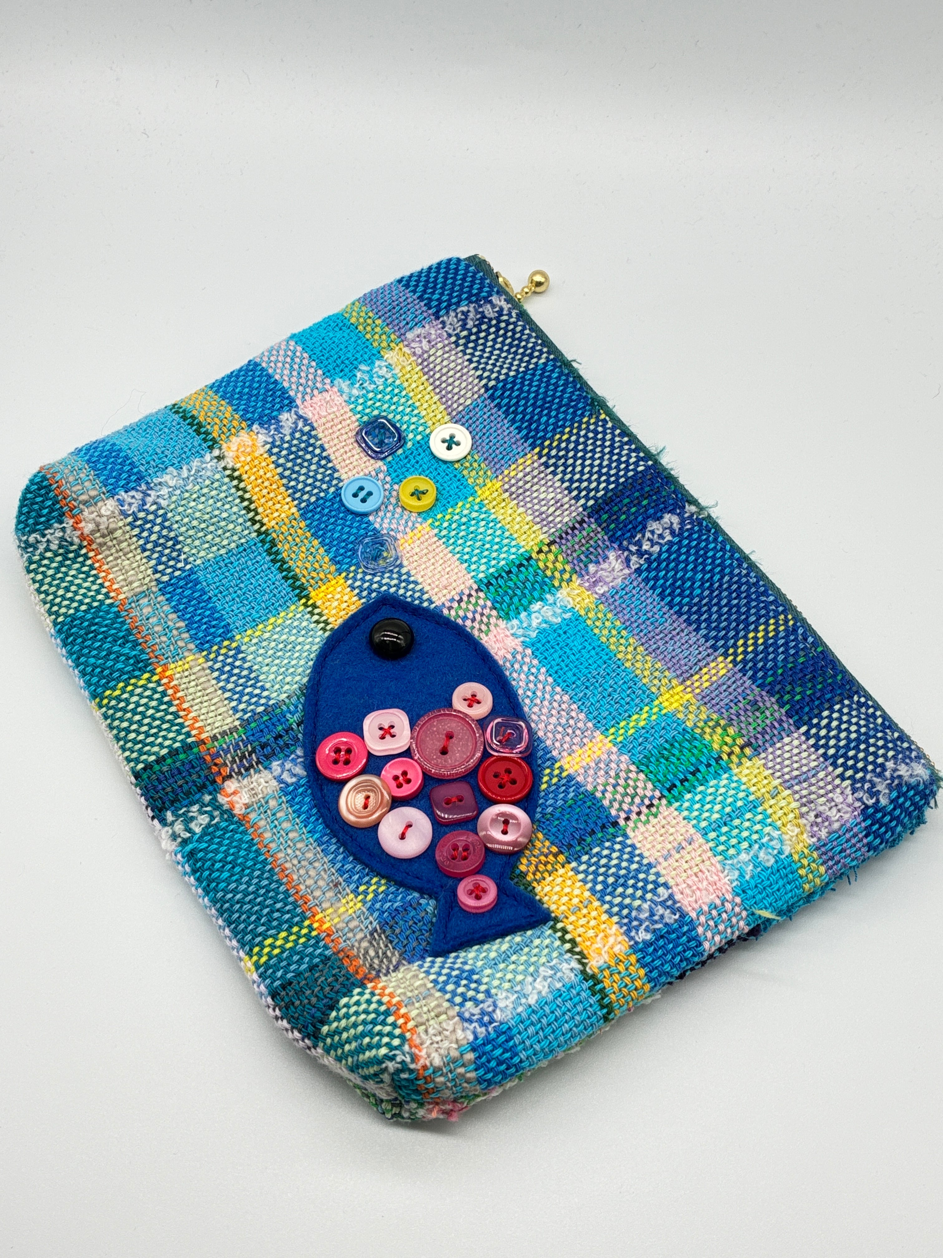 さをり織りのかわいいファスナーポーチです。さをり織りに、ボタンを使った飾りを縫い付けました。一つ一つ色柄が違います。