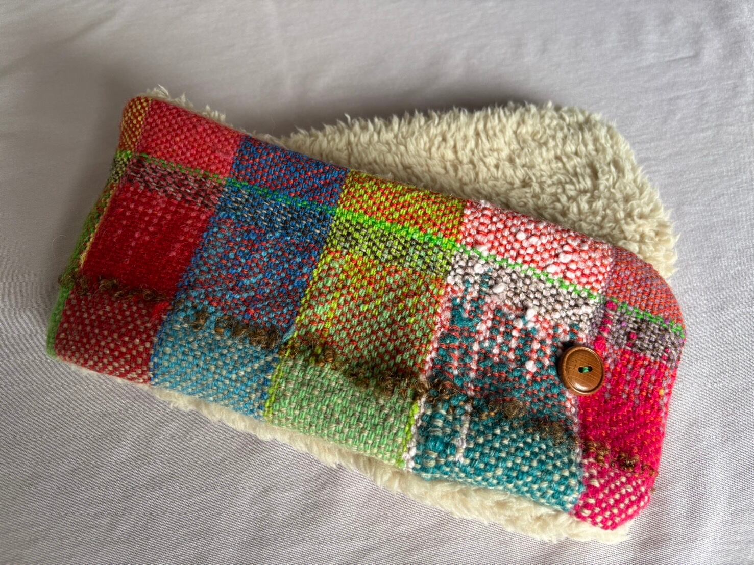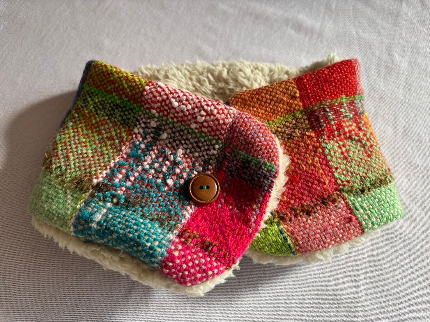 織生地はウール中心の素材で軽くて暖かです。手作り感のあふれる素朴なテイストカラフルな色合いが可愛いです。暗い色の多い冬のコーデの差し色に重宝します。